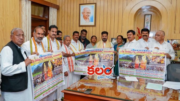 ఈ నెల 28, 29, 30, 31 తేదీల్లో జరిగే మేడారం మహా జాతర పోస్టర్ ను ముఖ్యమంత్రి రేవంత్ రెడ్డి సోమవారం ఆవిష్కరించారు. ఈ సందర్భంగా మంత్రులు కొండా సురేఖ, సీతక్క, పొంగులేటి శ్రీనివాస్ రెడ్డి, ఆలయ పూజారులు మేడారం జాతరకు రావాల్సిందిగా ముఖ్యమంత్రికి ఆహ్వాన పత్రికను అందజేశారు.