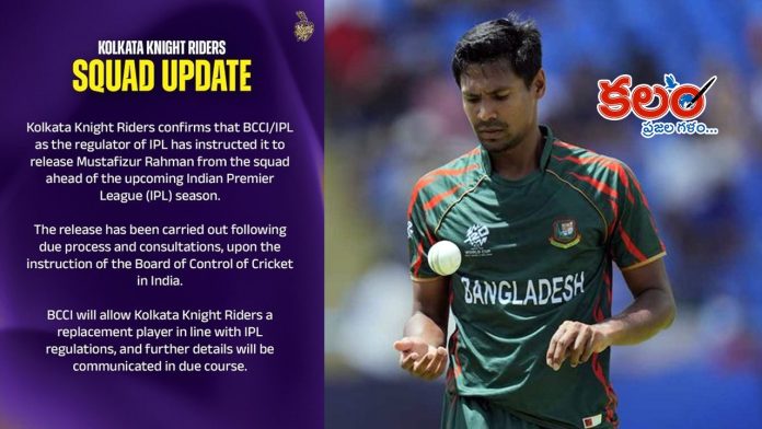 కలం, వెబ్ డెస్క్: బీసీసీఐ (BCCI) ఆదేశాల మేరకు కోల్కతా నైట్ రైడర్స్ (KKR) తమ జట్టులోని బంగ్లాదేశ్ స్టార్ పేసర్ ముస్తాఫిజుర్ రెహ్మాన్ (Mustafizur Rahman)ను విడుదల చేస్తున్నట్లు అధికారికంగా ప్రకటించింది. బంగ్లాదేశ్లో మైనార్టీలపై హింసాత్మక ఘటనల నేపథ్యంలో ఈ నిర్ణయం తీసుకున్నట్లు సమాచారం. కేకేఆర్ టీమ్ ఈ విషయాన్ని అధికారికంగా తెలిపింది.