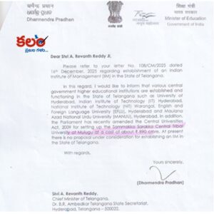 కలం, తెలంగాణ బ్యూరో : తెలంగాణకు ఇండియన్ ఇన్స్టిట్యూట్ ఆఫ్ మేనేజ్మెంట్ (IIM) ఇవ్వలేమని కేంద్ర ప్రభుత్వం స్పష్టం చేసింది. రాష్ట్రానికి ఐఐఎం ఇవ్వాల్సిందిగా గత బీఆర్ఎస్ ప్రభుత్వం పలుమార్లు కేంద్ర ప్రభుత్వానికి విజ్ఞప్తి చేసింది. రేవంత్రెడ్డి ముఖ్యమంత్రి అయిన తర్వాత కూడా ప్రధాని మోడీని కలిసినప్పుడు రాతపూర్వకంగా రిక్వెస్టు చేశారు. కేంద్ర విద్యా మంత్రి ధర్మేంద్ర ప్రదాన్కు సైతం గతేడాది డిసెంబరు 16న ముఖ్యమంత్రి రేవంత్రెడ్డి లేఖ రాశారు. కానీ ఈ రిక్వెస్టులన్నింటినీ కేంద్రం బుట్టదాఖలా చేసింది. తెలంగాణకు (Telangana) ఎందుకు ఐఐఎం ఇవ్వడం సాధ్యం కాదో నిర్దిష్టమైన కారణాలు చెప్పకపోయినా పలు అంశాలను ముఖ్యమంత్రి రేవంత్రెడ్డికి రాసిన రిప్లై లెటర్లో ధర్మేంద్ర ప్రదాన్ వివరించారు.