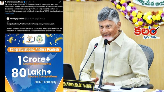 కలం, వెబ్ డెస్క్ : మిషన్ కర్మయోగి (Mission Karmayogi) లో భాగంగా ఆంధ్రప్రదేశ్ రికార్డు క్రియేట్ చేసింది. ఏకంగా కోటి ఎన్రోల్మెంట్స్, 80 లక్షల కోర్సులు పూర్తి చేసుకున్న మొదటి రాష్ట్రంగా ఆంధ్రప్రదేశ్ (Andhra Pradesh) నిలిచింది. ఈ విషయంపై ఆంధ్రప్రదేశ్ ముఖ్యమంత్రి చంద్రబాబు (Chandrababu) ఇంట్రెస్టింగ్ ట్వీట్ చేశారు. ఇది గొప్ప శుభవార్త.. ఐగాట్ కర్మయోగి పోర్టల్లో 4,290 కోర్సులలో కోటి కంటే ఎక్కువ నమోదులు కావడం, 80 లక్షల కోర్సుల పూర్తి జరగడం, నిరంతర అభ్యాసం పట్ల మన ప్రభుత్వ ఉద్యోగుల దృఢ సంకల్పాన్ని ప్రతిబింబిస్తోందని అన్నారు. ఆంధ్రప్రదేశ్ రాష్ట్ర అభివృద్ధి ప్రణాళిక సొసైటీ (APSDPS) సమర్థవంతంగా ముందుకు నడిపించిన ఈ విజయం.. ఆంధ్రప్రదేశ్కు నైపుణ్యం కలిగిన, చురుకైన, భవిష్యత్తుకు సిద్ధంగా ఉండే పరిపాలనను నిర్మిస్తుందని చంద్రబాబు ట్వీట్ చేశారు.