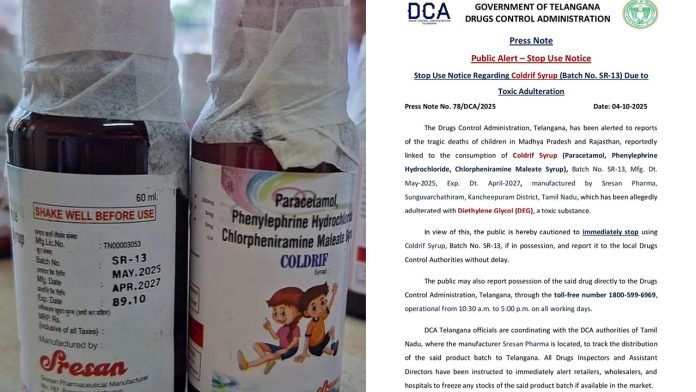 తమిళనాడులోని కాంచీపురం జిల్లా, సుంగువర్చతిరంలోని శ్రేసన్ ఫార్మా తయారు చేసిన కోల్డ్రిఫ్ సిరప్(Coldrif Syrup) తాగిన మధ్యప్రదేశ్, రాజస్థాన్ కి చెందిన 11 మంది పిల్లలు మరణించారు. ఈ నివేదికల గురించి తెలంగాణ డ్రగ్స్ కంట్రోల్ అడ్మినిస్ట్రేషన్ అప్రమత్తమైంది. ఈ సిరప్ విషపూరితమైన డైథిలిన్ గ్లైకాల్ (DEG)తో కల్తీ చేయబడిందని ఆరోపణలు వెలువడ్డాయి. దీంతో కోల్డ్రిఫ్ సిరప్, బ్యాచ్ నం. SR-13 ను ఎవరైనా తమ దగ్గర ఉంటే వెంటనే వాడటం మానేయాలని, ఆలస్యం చేయకుండా స్థానిక డ్రగ్స్ కంట్రోల్ అధికారులకు నివేదించాలని తెలంగాణ డ్రగ్స్ కంట్రోల్ అడ్మినిస్ట్రేషన్ హెచ్చరికలు జారీ చేసింది.