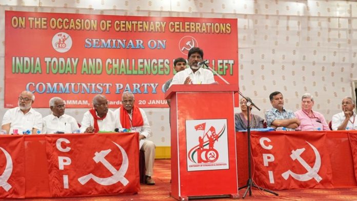 కలం, ఖమ్మం బ్యూరో : ఖమ్మం, నల్లగొండ, వరంగల్ జిల్లాలో ఏ ఇంటి తలుపు తట్టినా ఒక పోరాట గాథ వినిపిస్తుందని డిప్యూటీ సీఎం మల్లు భట్టి విక్రమార్క (Deputy CM Bhatti) తెలిపారు. మంగళవారం ఆయన ఖమ్మం జిల్లా కేంద్రంలో సిపిఐ శత వసంతాల సందర్భంగా ఏర్పాటు చేసిన జాతీయ సెమినార్ లో మాట్లాడుతూ.. కాంగ్రెస్ పాలకులు బూర్గుల రామకృష్ణారావు 1950లో కౌలుదారి చట్టాన్ని తీసుకువచ్చారనీ, ఆ తర్వాత 1970లో దేశవ్యాప్తంగా కాంగ్రెస్ ప్రభుత్వం భూ సంస్కరణల చట్టం, పేదల అభివృద్ధికి 20 సూత్రాల పథకం వంటి గొప్ప చట్టాలను వామపక్ష పార్టీల సహాయంతో కాంగ్రెస్ ప్రభుత్వాలు ఈ దేశంలో, రాష్ట్రంలో తీసుకురాగలిగాయి అన్నారు.
