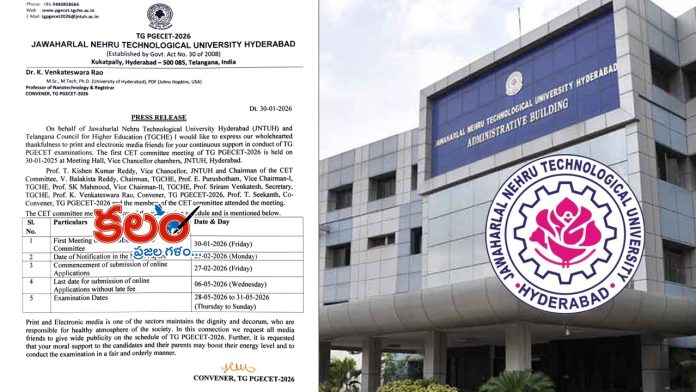కలం, వెబ్ డెస్క్ : జవహర్‌లాల్ నెహ్రూ టెక్నలాజికల్ యూనివర్సిటీ హైదరాబాద్ (JNTUH) ఆధ్వర్యంలో నిర్వహించనున్న తెలంగాణ పీజీఈసెట్ 2026 (TG PGECET–2026) సంబంధించిన తొలి సెట్  కమిటీ సమావేశం జనవరి 30(శుక్రవారం) న JNTUH వైస్ ఛాన్సలర్ కార్యాలయంలో జరిగింది. ఈ సమావేశానికి JNTUH వీసీ ప్రొఫెసర్ టి. కిషన్ కుమార్ రెడ్డి, TGCHE చైర్మన్ వి. బాలకిష్టా రెడ్డి, ఇతర కమిటీ సభ్యులు హాజరయ్యారు.