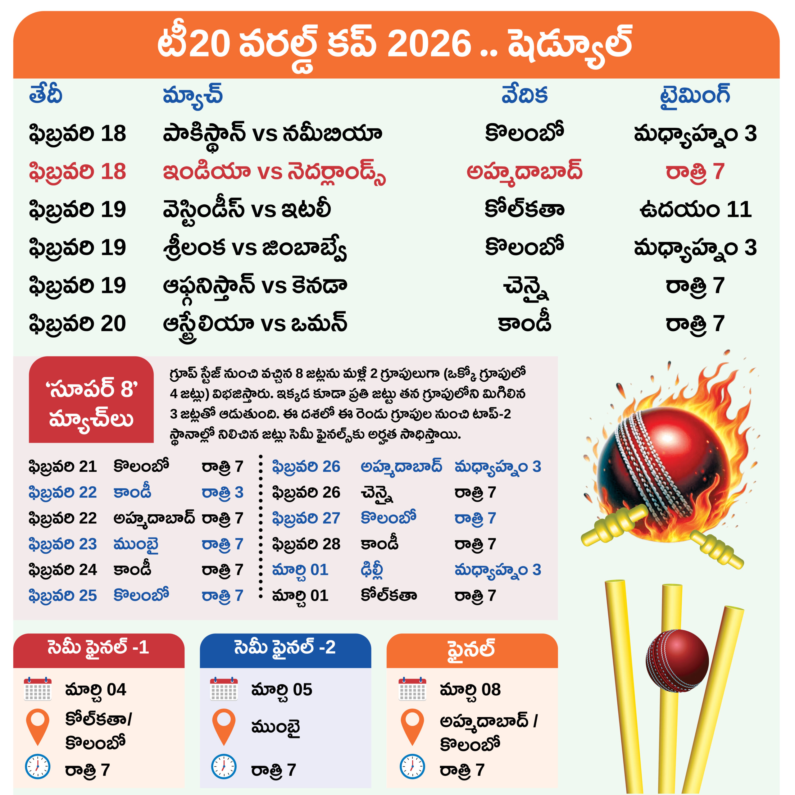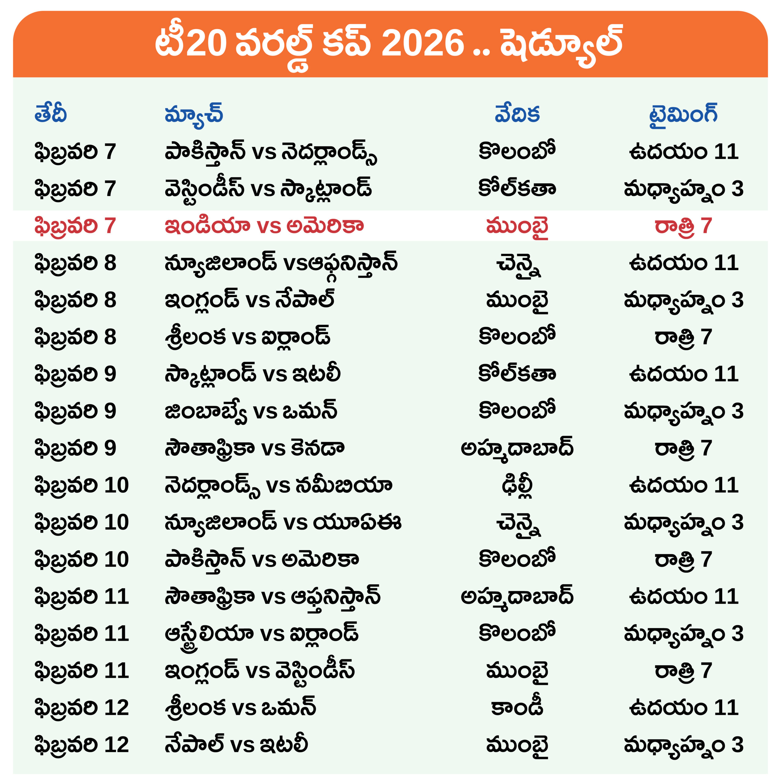 గ్రూప్ ఏ: ఇండియా, పాకిస్థాన్, అమెరికా, నెదర్లాండ్స్, నమీబియా