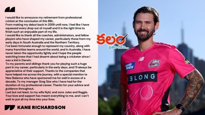కలం, స్పోర్ట్స్ : ఆస్ట్రేలియా క్రికెట్కు స్టార్ పేస్ బౌలర్ వీడ్కోలు పలికాడు. వెటరన్ పేసర్ కేన్ రిచర్డ్సన్ (Kane Richardson) ప్రొఫెషనల్ క్రికెట్కు గుడ్బై చెబుతూ తన రిటైర్మెంట్ను అధికారికంగా ప్రకటించాడు. తాజాగా ముగిసిన బిగ్ బాష్ లీగ్ సీజన్తోనే తన ప్రయాణానికి ముగింపు పెట్టినట్టు వెల్లడించాడు. 34 ఏళ్ల రిచర్డ్సన్ సిడ్నీ సిక్సర్స్ తరఫున ఆడిన చివరి బీబీఎల్ సీజన్ అనంతరం ఈ నిర్ణయం తీసుకున్నాడు. ఫైనల్స్లో జట్టు పరాజయం పొందిన తర్వాత తన కెరీర్ను అక్కడితో ముగించడమే సరైన సమయమని భావించినట్టు తెలిపాడు.