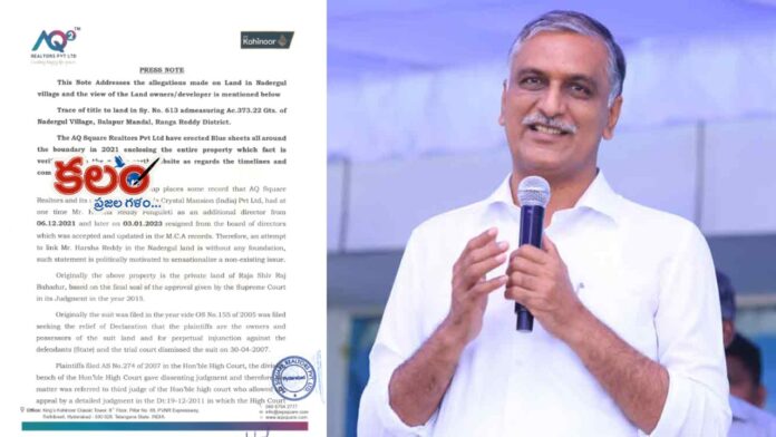 ‘నాదర్గూల్ భూ వ్యవహారాన్ని పొంగులేటికి హర్ష రెడ్డి అపాదించడం సరికాదు. ఈ భూమి రాజా శివ్ రాజ్ బహదూర్కు చెందిన ప్రైవేట్ ఆస్తి, 2015లో సుప్రీంకోర్టు ఇచ్చిన తుది తీర్పుతో ఆయన వారసులే హక్కుదారులని ధ్రువీకరించబడింది. అసలు ఈ భూమిపై వివాదం 2005లో OS నెంబర్ 155తో ప్రారంభమైంది. యాజమాన్యం ఆక్యుపెన్సీ హక్కులపై డిక్లరేషన్, రాష్ట్ర ప్రభుత్వ జోక్యాన్ని నిలువరించాలని కోరుతూ పిటిషనర్లు కోర్టును ఆశ్రయించారు. అయితే 30 ఏప్రిల్ 2007న ట్రయల్ కోర్టు ఈ కేసును కొట్టివేసింది. దీనిపై హైకోర్టులో AS నంబర్ 274/2007 ద్వారా అప్పీల్ దాఖలైంది. డివిజన్ బెంచ్లో భిన్నాభిప్రాయాల కారణంగా కేసు మూడో న్యాయమూర్తికి వెళ్లింది. 19 డిసెంబర్ 2011న వెలువడిన తీర్పులో పిటిషనర్లను పూర్తి యజమానులుగా కోర్టు గుర్తించింది. రాష్ట్ర ప్రభుత్వం జోక్యం చేసుకోకుండా శాశ్వత ఇంజంక్షన్ కూడా మంజూరు చేసింది. రాష్ట్ర ప్రభుత్వం/APIIC 2013లో దాఖలు చేసిన సివిల్ అప్పీలు (2963, 2964)ను సుప్రీంకోర్టు తిరస్కరించింది. సదరు భూయజమానులకు ఆక్యుపెన్సీ హక్కులు వర్తించేలా ఉత్తర్వులిచ్చింది. భూమి విస్తీర్ణం అధికంగా ఉండటంతో ల్యాండ్ రిఫార్మ్స్ చట్టం వర్తించాలనే ప్రశ్న తలెత్తినప్పుడు, 2015 వరకు భూమి వివాదంలో ఉండటంతో ఆ చట్టం అమలు కాదు.’ అంటూ కోహినర్ సంస్థ పేర్కొన్నది.