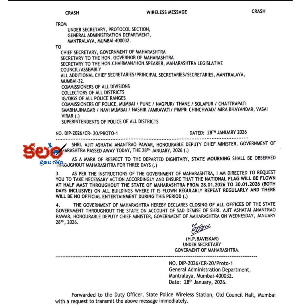 కలం, వెబ్ డెస్క్: మహారాష్ట్ర డిప్యూటీ సీఎం అజిత్ పవార్ (Ajit Pawar) విమానప్రమాదంలో ఆకస్మికంగా మృతి చెందిన విషయం తెలిసిందే. దీంతో ప్రభుత్వం మూడు రోజులు సంతాపదినాలు ప్రకటించింది. జనవరి 28న (బుధవారం) రాష్ట్రవ్యాప్తంగా సెలవు డిక్లేర్ చేసింది. సంతాప సూచకంగా జాతీయ జెండాను జనవరి 28, 2026 నుంచి 30, 2026 వరకు రాష్ట్రవ్యాప్తంగా Half-mast (హాఫ్ మాస్ట్) సగం వరకు ఎగరవేయనున్నారు.