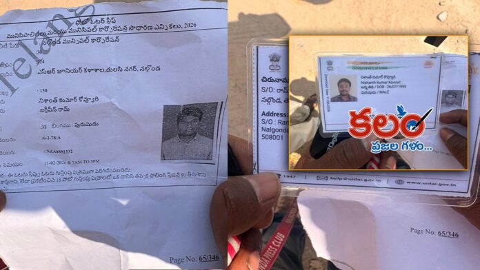 కలం, నల్లగొండ బ్యూరో: నల్లగొండ మున్సిపల్ కార్పొరేషన్ (Nalgonda Corporation) ఎన్నికల్లో నకిలీ ఓట్ల కలకలం చెలరేగింది. ఓ వ్యక్తి 30వ వార్డులో ఆధార్ కార్డును మార్పింగ్ చేసి ఓటు వేసేందుకు ప్రయత్నించారు. అయితే ఆ సమయంలో అక్కడే ఉన్న బీఆర్ఎస్ అభ్యర్థి జహంగీర్ సదరు ఓటరు నకిలీ అంటూ గుర్తించారు. నిజమైన ఓటరు సౌతాఫ్రికాలో ఉంటారని.. ఈయన అసలు వ్యక్తి కాదని పోలీసుల దృష్టికి తీసుకెళ్లారు. దీంతో పోలింగ్ బూత్లో గందరగోళం ఏర్పడింది.