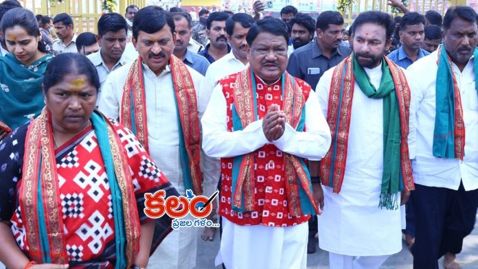 కలం, వరంగల్ బ్యూరో: కేంద్ర మంత్రులు జి. కిషన్ రెడ్డి(Kishan Reddy), కేంద్ర గిరిజన వ్యవహారాల శాఖ మంత్రి జువాల్ ఓరం (Jual Oram) గురువారం మేడారం చేరుకుని సమ్మక్క–సారలమ్మను దర్శించుకున్నారు. రాష్ట్ర మంత్రులు సీతక్క, పొంగులేటి శ్రీనివాస్ రెడ్డి, అడ్లూరి లక్ష్మణ్ కుమార్, జిల్లా కలెక్టర్ దివాకర వారికి డోలు డప్పులతో ఘన స్వాగతం పలికారు. ఆలయ ప్రాంగణంలో పూజారులు, అధికారులు కేంద్ర మంత్రులకు స్వాగతం పలికి అమ్మవార్ల ఆశీర్వచనాలు, ప్రసాదం అందజేసారు.